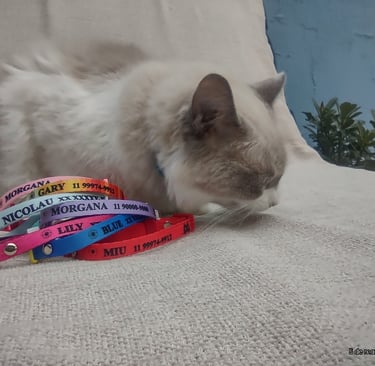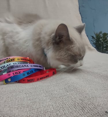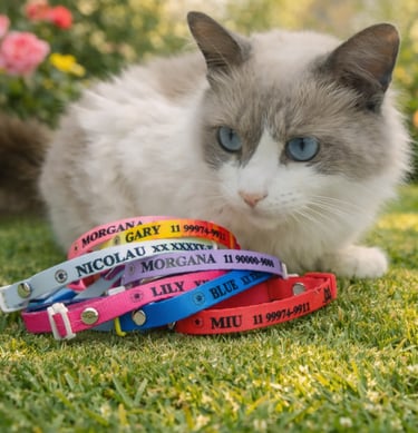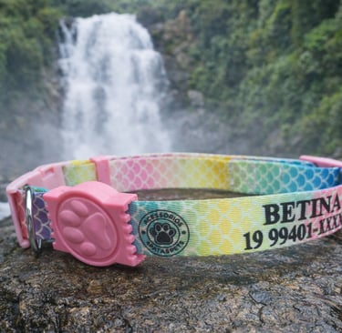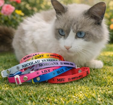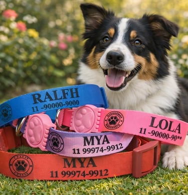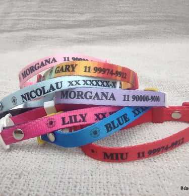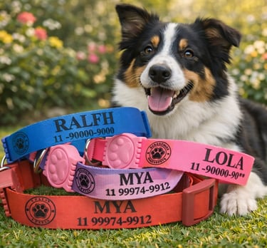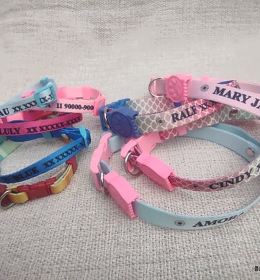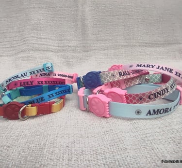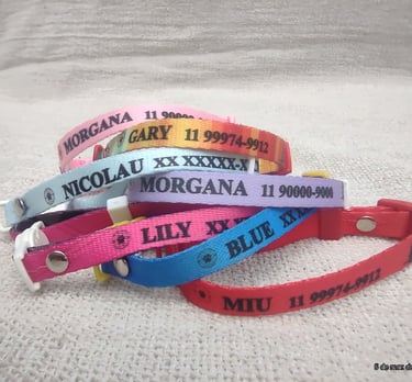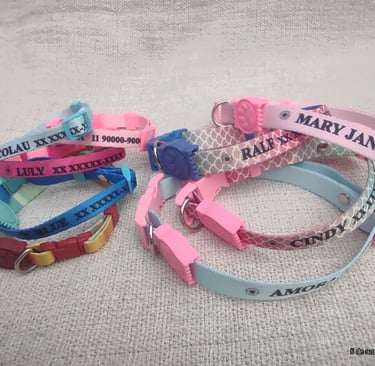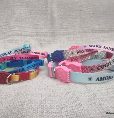 Coleira personalizada com o nome do seu pet e telefone do tutor. Feita com materiais de alta qualidade, garante conforto e segurança para o seu amigo de quatro patas. Escolha entre diversas cores e estilos para combinar com a personalidade do seu pet.
